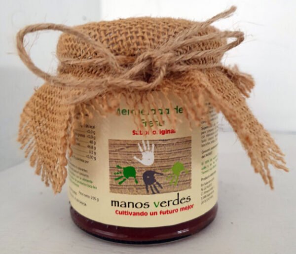 Mermelada de fresa artesanal elaborada con fruta seleccionada y azúcar de caña ecológico. Sin conservantes ni colorantes.
