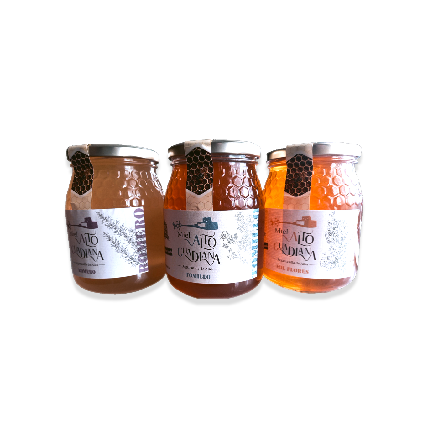 Este pack exclusivo reúne nuestras mieles claras primaverales: Mil Flores, Romero y Tomillo, tres variedades únicas elaboradas artesanalmente en los Montes de la Ossa de Montiel y Argamasilla de Alba, corazón de La Mancha.