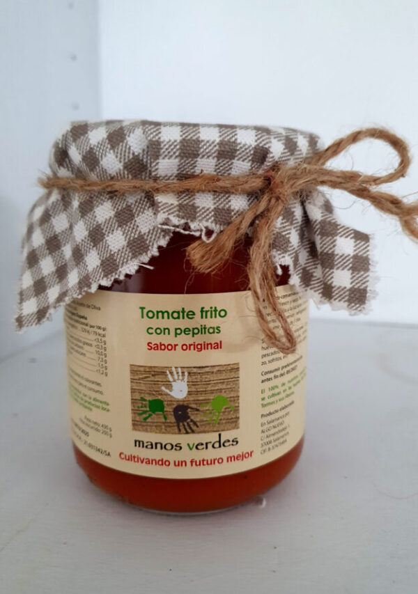 Tomate frito artesanal con pepitas, elaborado con tomate de cultivo sostenible y AOVE. Sabor auténtico y textura tradicional sin aditivos.
