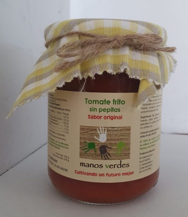 Tomate frito artesanal sin pepitas, textura homogénea y suave. Elaborado con ingredientes naturales y sin aditivos.